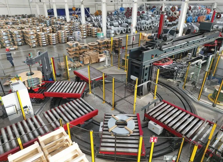 Slit coils are laid down on a carousel for additional packaging.