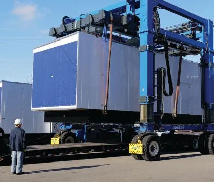 A completed generator unit is loaded on a truck for delivery.