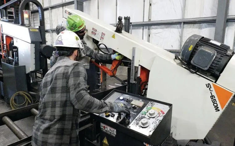 Saw operators at Acoustical Sheetmetal prepare the Cosen SH-650M band saw for a new cut.