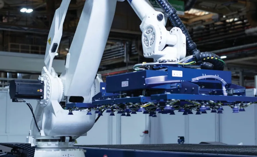 Downstream from the laser cutting unit, two robots remove the components from the coil strip and carefully place them down. A small amount of scrap is automatically transported to a container outside. The part production process continues.